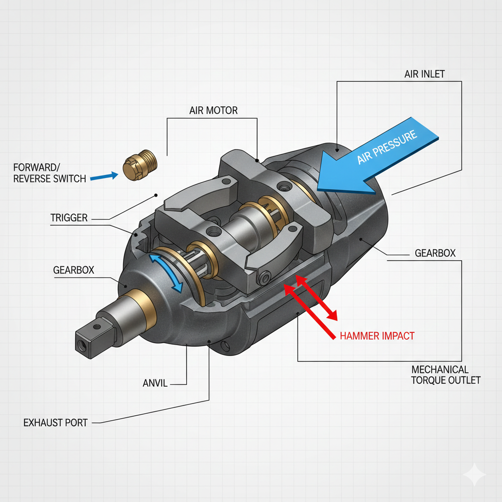 Srce a pneumatski udarni ključ je njegov zračni motor. Kada korisnik povuče okidač, komprimirani zrak ulazi u alat i okreće rotor. Ovaj je rotor povezan s "udarnim mehanizmom"—obično s dvostrukim čekićem ili psećom ljuljačkom. Dok se rotor vrti, on stvara kinetičku energiju. Kada otpor vijka postane veći od sile okretanja motora, unutarnji čekići udaraju u izlaznu osovinu (nakovanj), isporučujući iznenadni, masivni nalet rotacijske sile. To se događa stotine ili čak tisuće puta u minuti.